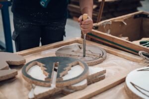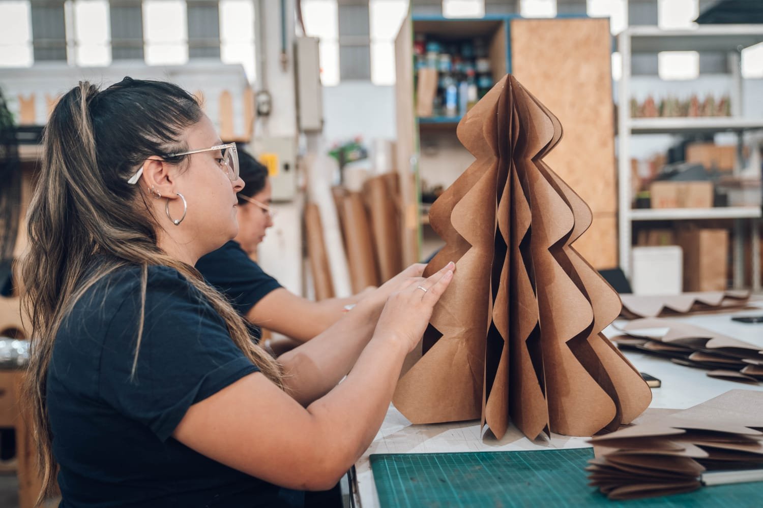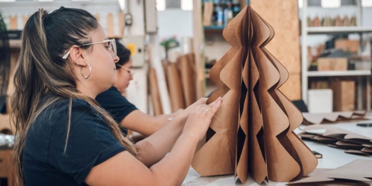 Tiene una altura de 12 metros y está adornado con esferas, campanas y pinitos, elaborados con 105 kilos de MDF y aglomerado recuperado de la industria maderera.